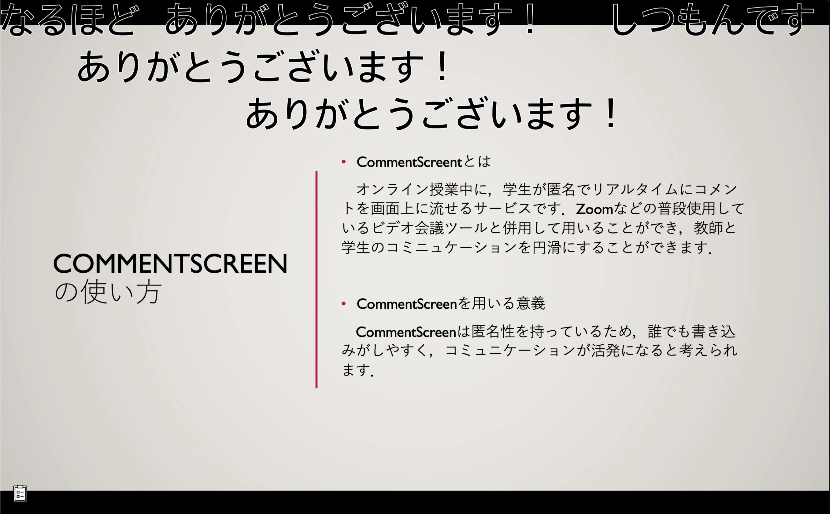CommentScreenとは,ビデオ会議ツールの画面上にリアルタイムでコメントを流せるサービスです.オンライン授業で普段使用しているZoomなどのビデオ会議ツールと併用することで,学生からコメントをもらうことができ,教員と学生のコミニュケーションを円滑にすることができます.