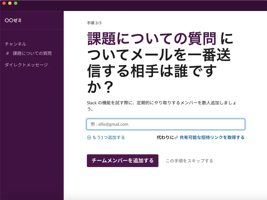 - 次に先ほど決めたチャンネルの利用者を尋ねる「メールを一番送信する相手は誰ですか」という画面が出てきます.ワークスペースに招待する人のメールアドレスを入力する場面ですが,この工程は後ほど行うのでスキップします.