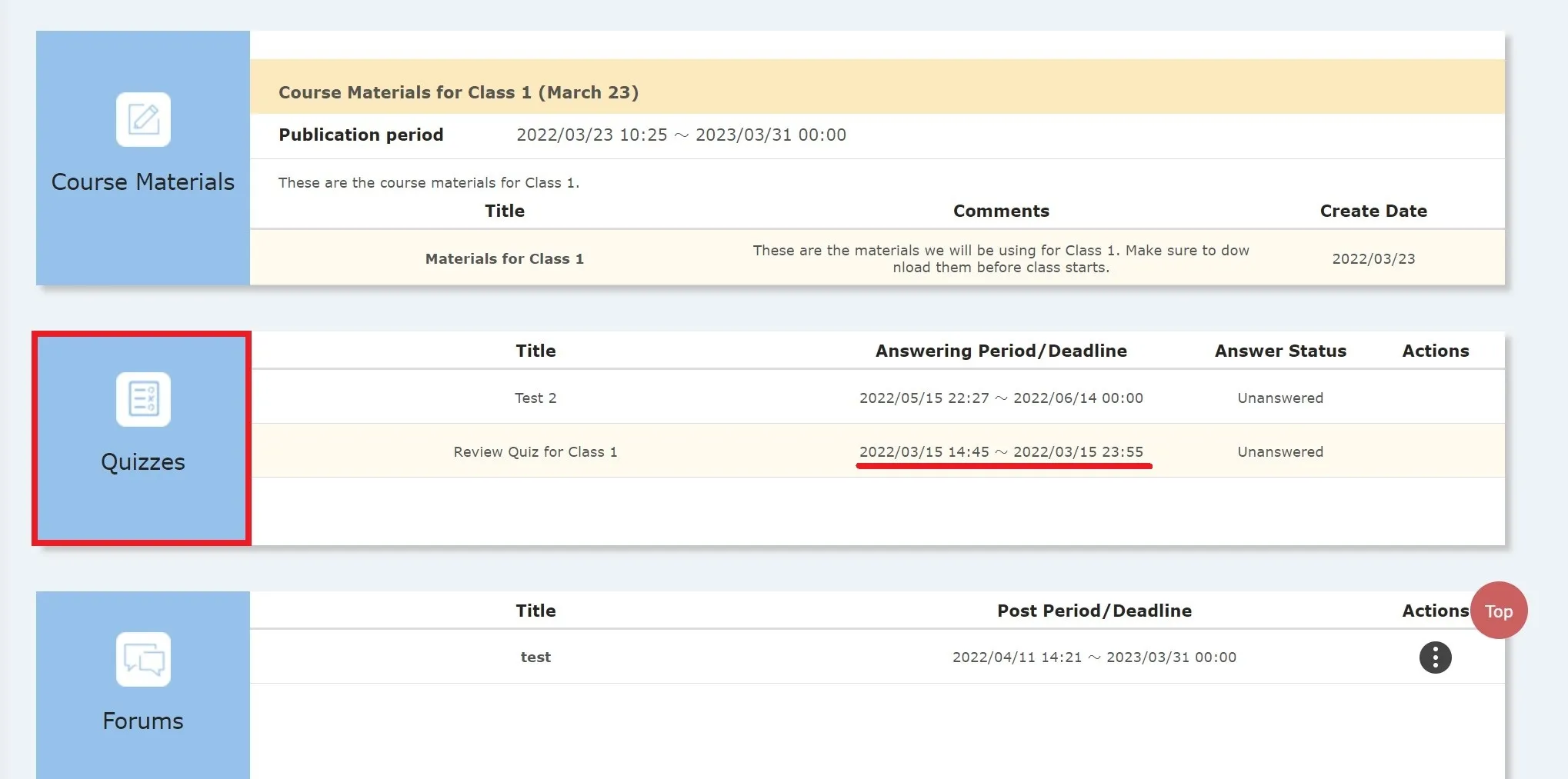 For example, by using LMS to manage tests and assignments, you can easily set submission deadlines and inform students of them, and can provide them to students in an easy-to-read format. Other advantages include the ability to significantly reduce administrative work by eliminating the need to distribute materials to students who have lost their handouts or were absent, the ease of managing reaction papers in large classes, and the ability to assign online discussions to students for learning outside of class.