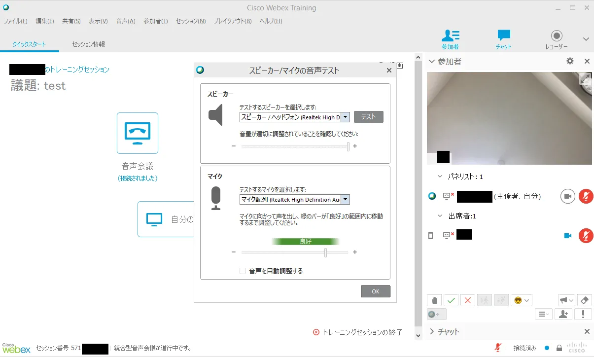• Entering the training session, the screen shows “Test your speaker/ microphone”. Choose the speaker and mirophone that you want to use. Click OK button and test your speaker and microphone.