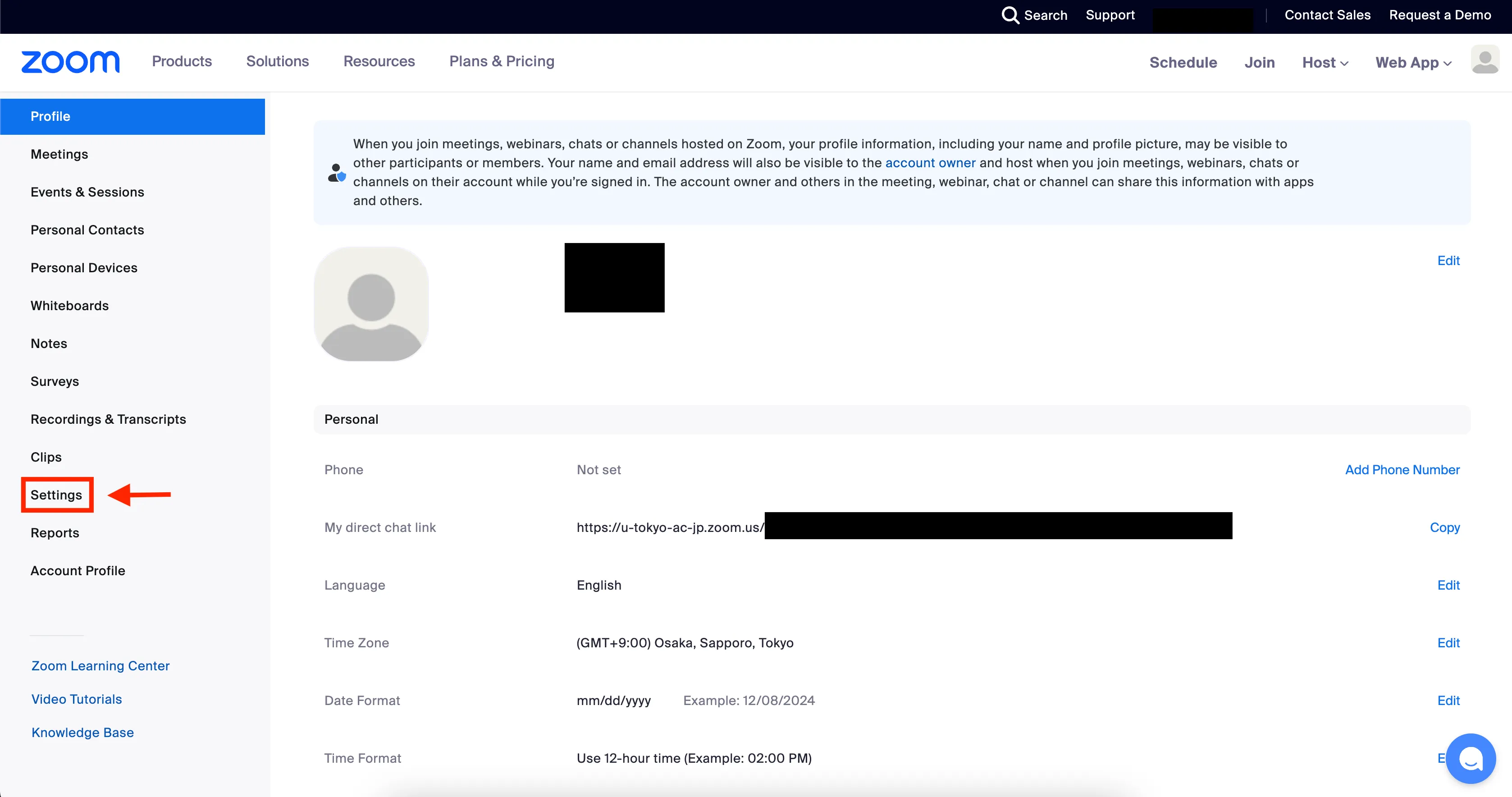 By selecting “Settings” in the side menu of your Zoom profile page, you will open the “My Settings” page. Features such as “Breakout Rooms” (to divide participants into separate rooms) and “Screen Sharing” (to share your screen with other participants) are not included in the meeting creation settings and must be configured from this separate “My Settings” page. Please note that settings made in “My Settings” will apply to all meetings you create.