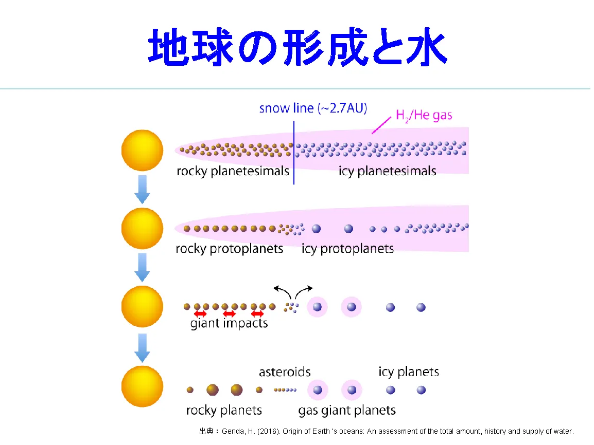- 地球の誕生と進化:ジャイアントインパクト、マグマオーシャン、コア-マントルの分離から始まる固体地球の形成と進化について議論する