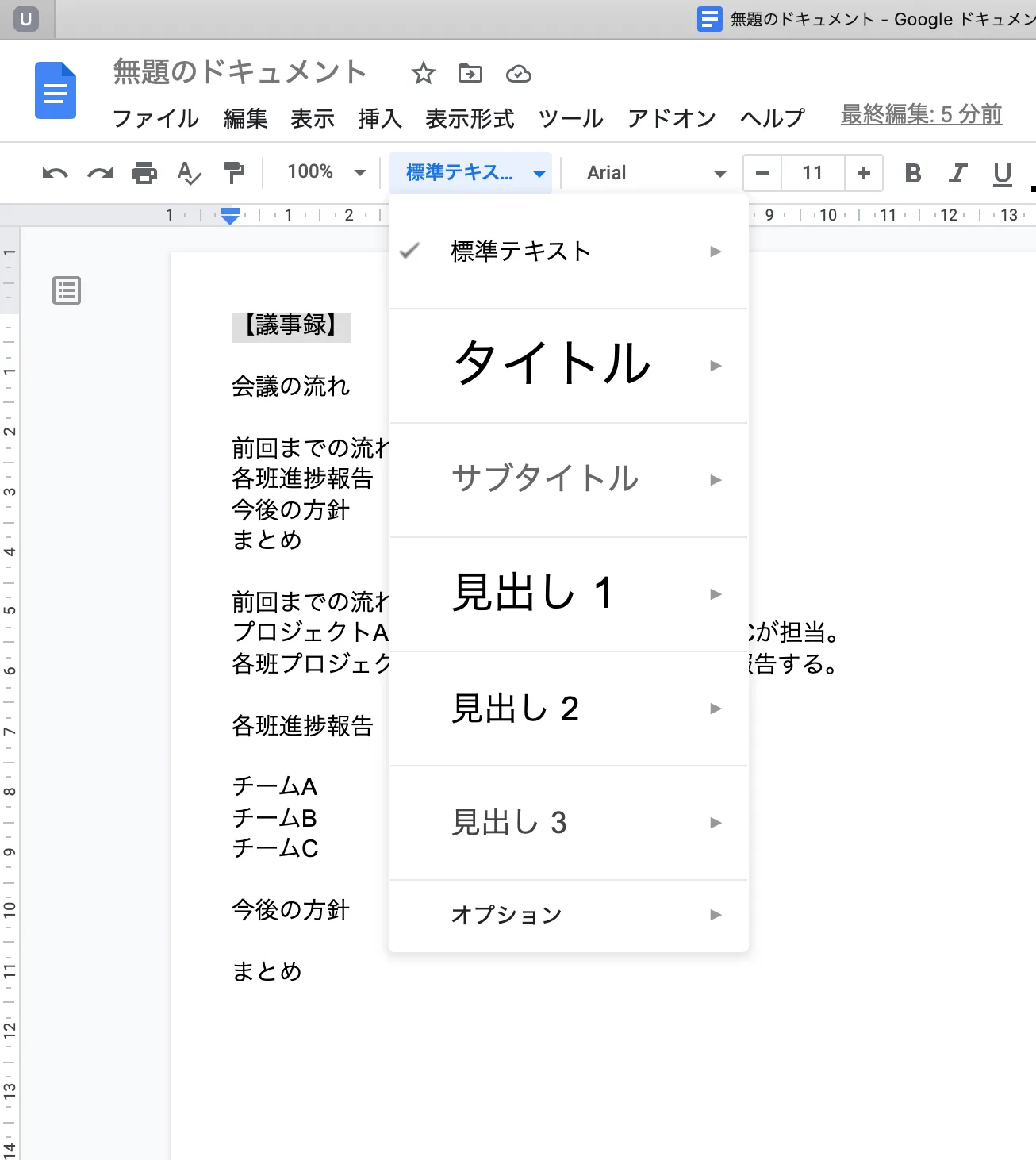 上の例では,「【議事録】」を「見出し2」に,「会議の流れ」「前回までの流れ」「各班進捗報告」「今後の方針」「まとめ」をそれぞれ「見出し3」に設定しました.