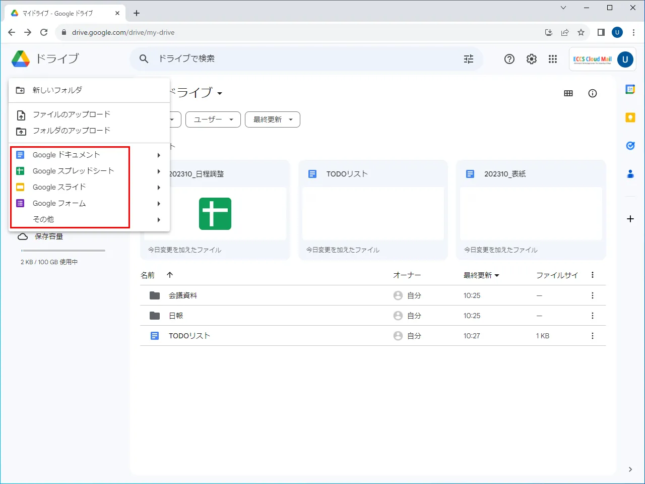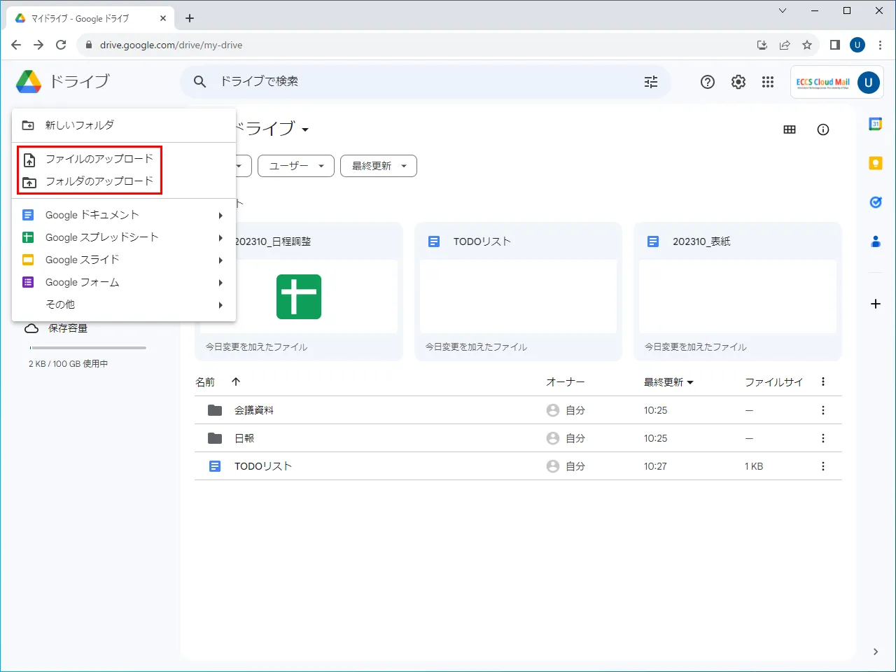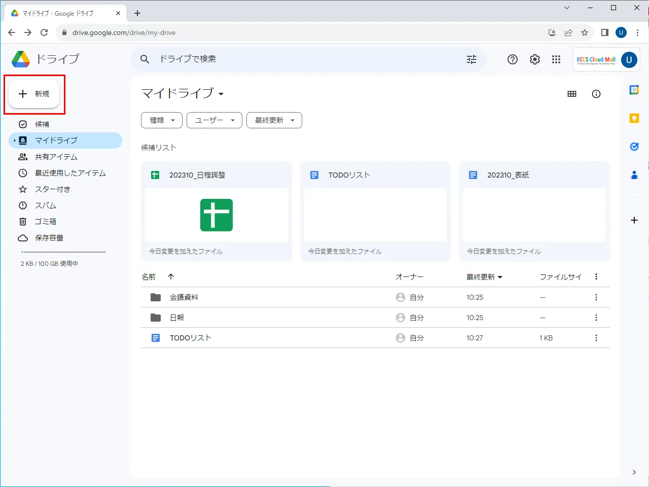 以降の手順を行うには,あらかじめECCSクラウドメールにログインし,ブラウザ上でGoogleドライブを開いている必要があります.この作業が完了していない場合には,Googleドライブのページの「ブラウザ上でGoogleドライブを開く」を参照してください.
