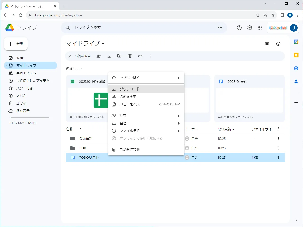 複数のファイルをまとめてダウンロードすることも可能です.具体的には,フォルダの画面でCtrlキー (Windows) または⌘キー (Mac) を押しながらクリックすると複数のファイルを選択することができ,その状態から右クリックメニューで「ダウンロード」を押すことで,選択していたファイルがダウンロードされます.