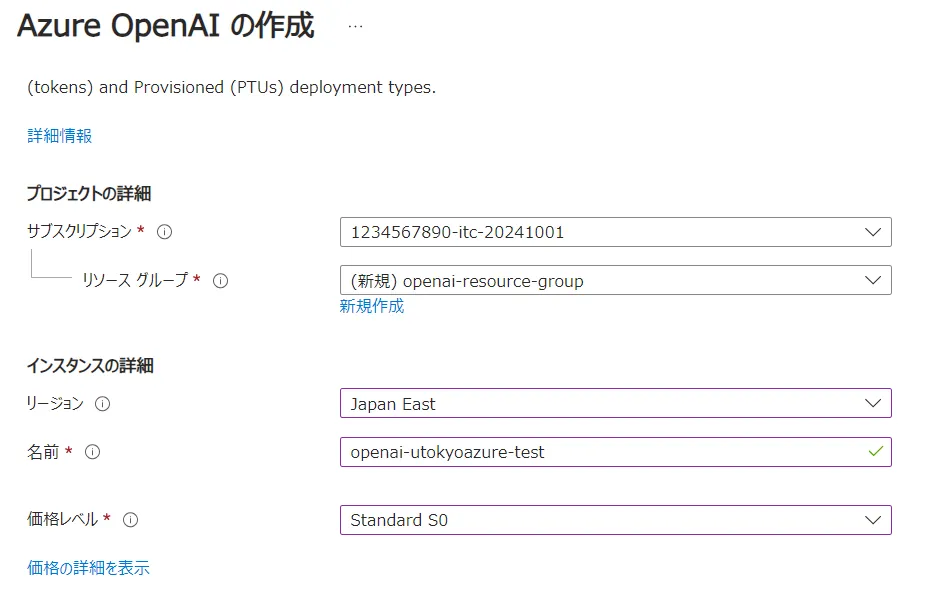 - サブスクリプション:事前に申請したサブスクリプションがすでに設定されていますので、通常はそのままで問題ありません.設定が無い場合はサブスクリプションが作成完了しているかどうか確認ください.