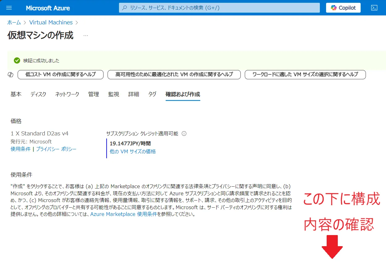 構成内容の検証結果,1時間ごとの予想費用,使用条件及びここまで設定してきた内容の詳細の確認の画面が表示されるので,問題が無ければ画面左下の確認及び作成ボタンをクリックしてください.