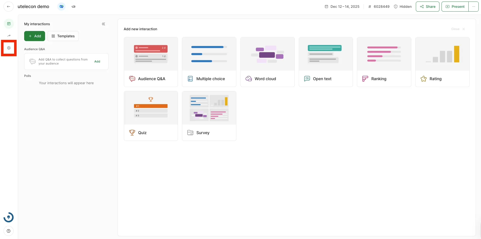 設定はイベントの主催者側画面左上の「Settings」(歯車アイコン)を選択することで行うことができます.主催者側画面には,イベントの一覧ページからアクセスしてください.