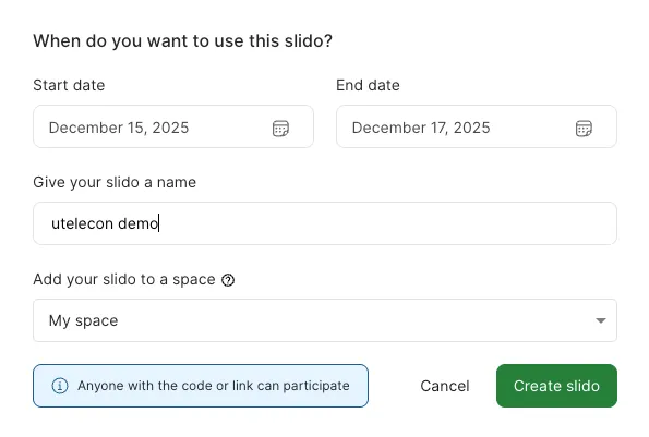 - 画面上の「Create slido」あるいは「Create a slido」を選択してから,「Start date」にイベントの開始日,「End date」にイベントの終了日,「Give your slido a name」にイベントの名前を入力します.「Add your slido to a space」を選択することで,イベントを行うスペース(イベントを整理できる共有ワークスペースのこと)を選択することができます.