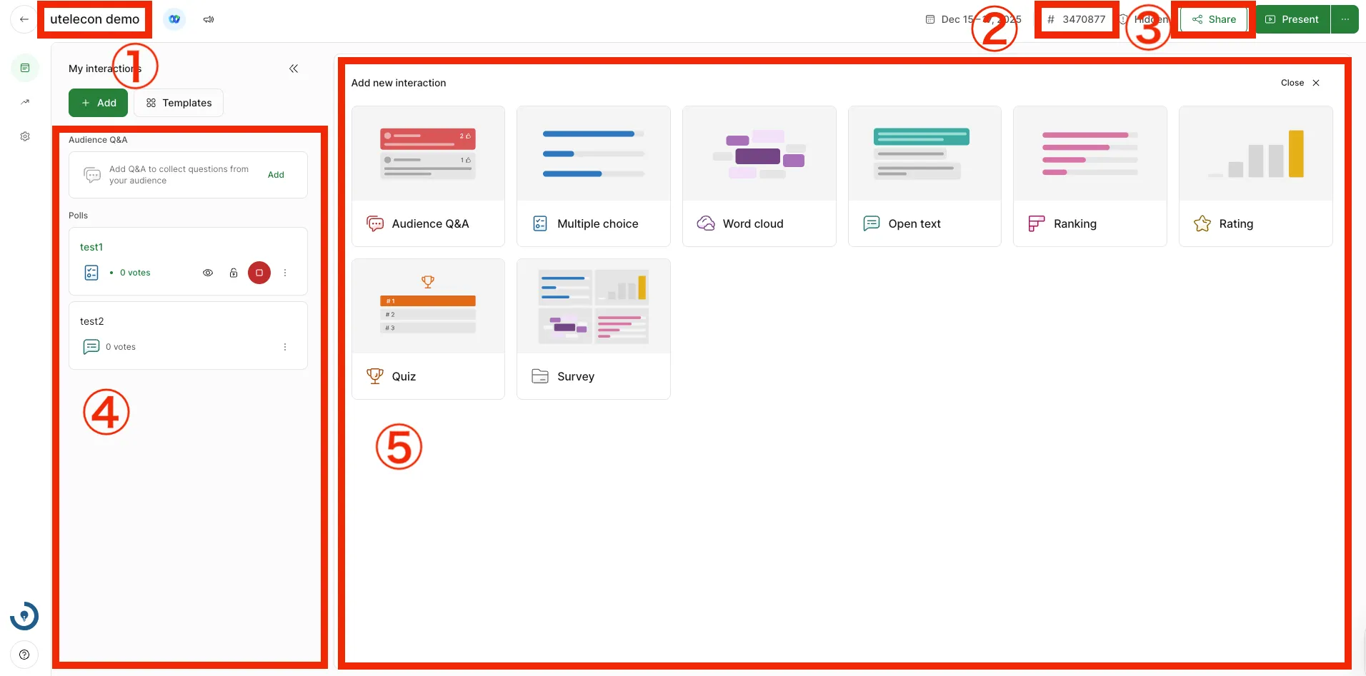 投票を作成するには,画面左上の「+Add (Add new interaction)」を選択してください.