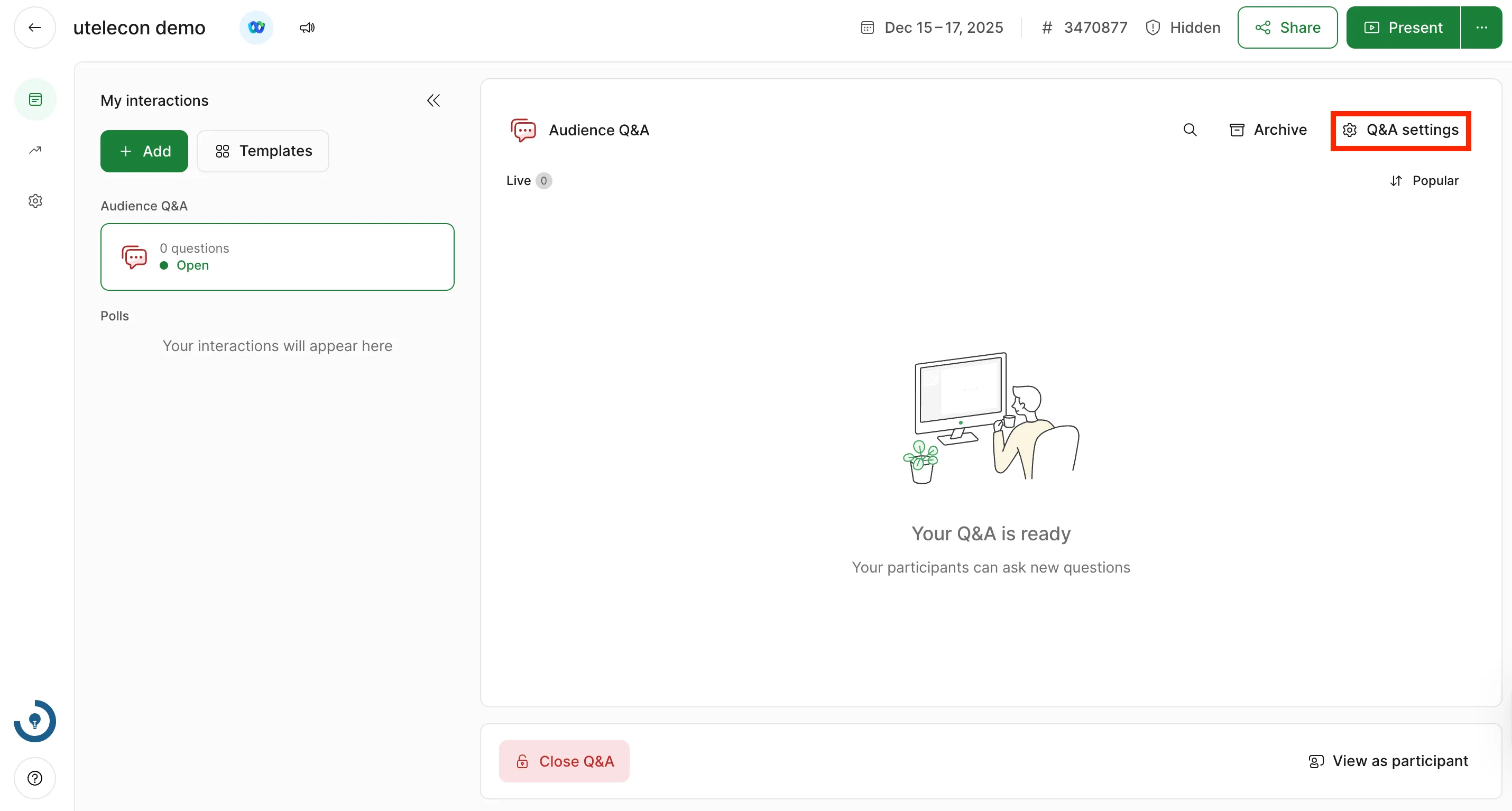 Q&Aを作成するには,画面左上または「Add new interaction」内の「Audience Q&A」を選択してください.