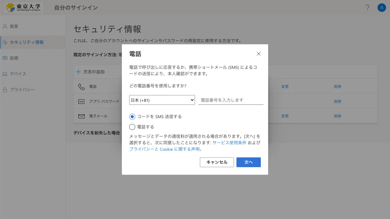手順を終えると,その後UTokyo Accountにサインインする際,毎回,設定したSMSや専用のアプリなどで本人確認することが求められます.登録した本人確認方法(スマホのアプリや電話番号)が利用できない状態ではUTokyo Accountにサインインすることができなくなりますので,十分ご注意ください.