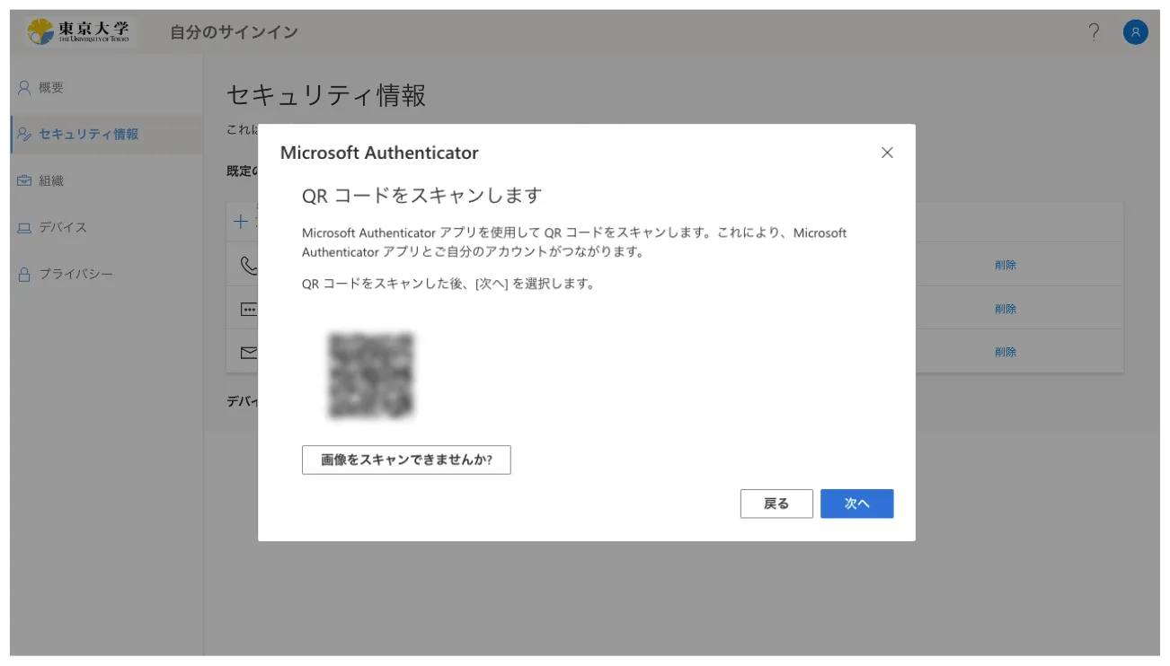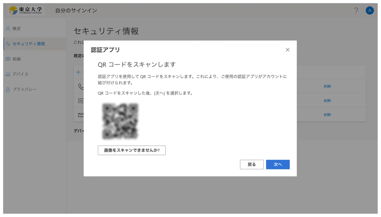 画面の指示に従って進むとQRコードが表示されるので,お使いの認証アプリでQRコードを読み取り,設定を行ってください.
