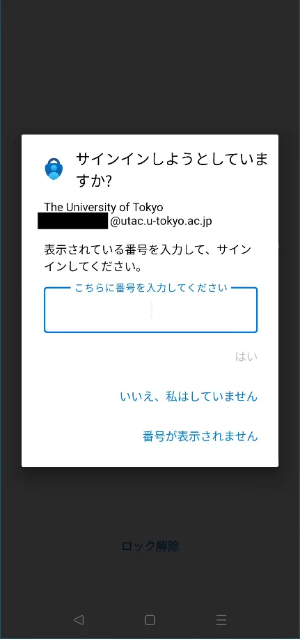 「試してみましょう」という画面に2桁の数字が表示され,同時にスマホのMicrosoft Authenticatorアプリ上に数字を入力する欄が表示されます.この2桁の数字を入力欄に入力し,「はい」を押してください.