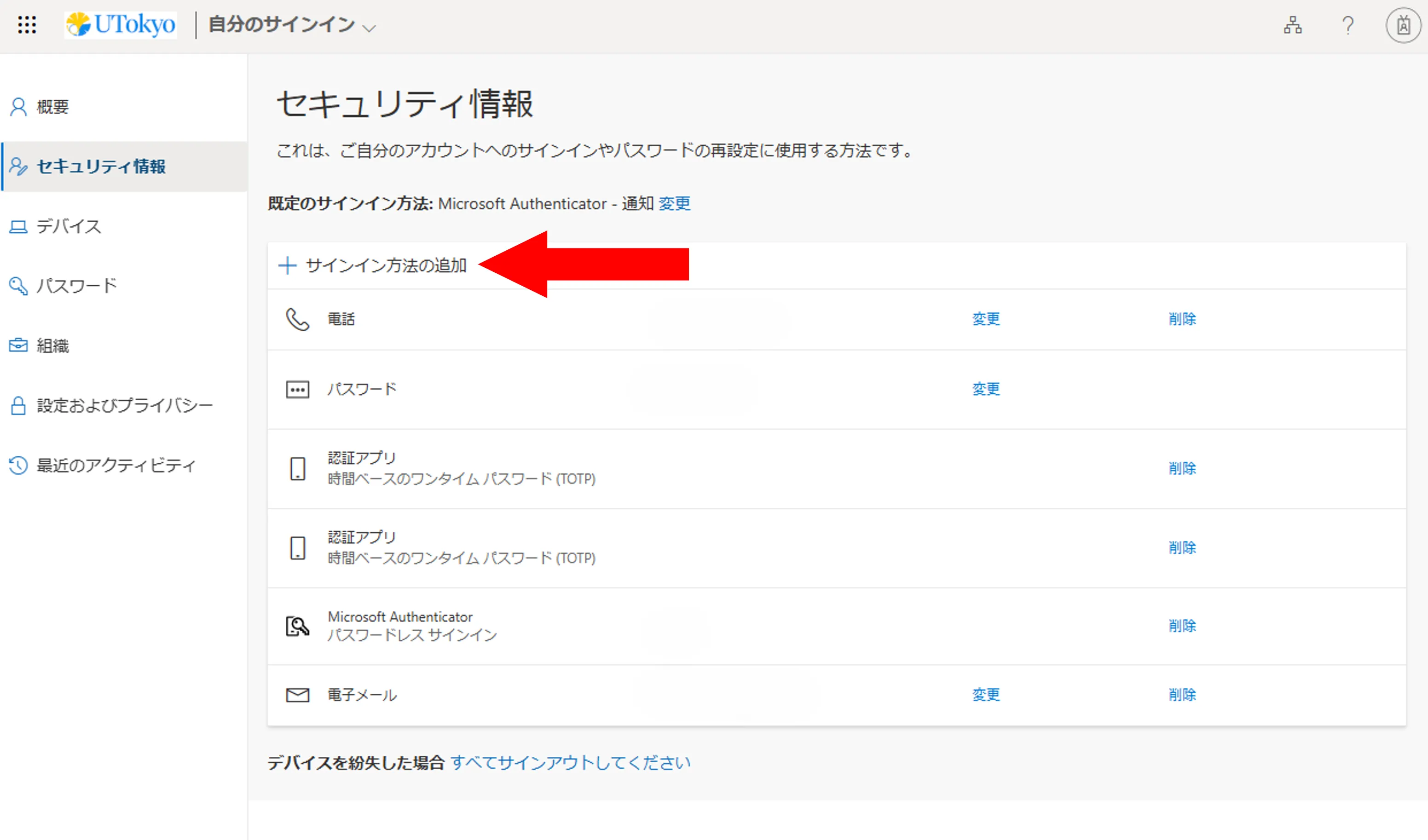 本人確認方法を1個しか登録していなくても多要素認証を利用することはできますが,故障や機種変更などで登録されている本人確認方法が使えなくなった場合,UTokyo Accountにサインインできなくなってしまいます.このような事態を防ぐため,必ず複数の本人確認方法を登録してください.