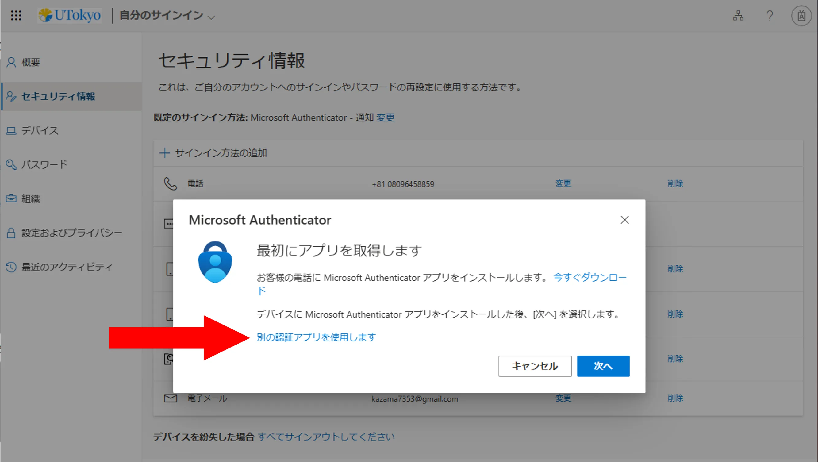 「別の認証アプリを使用します」というリンクを探して押してください.