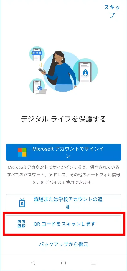 - 「デジタル ライフを保護する」という画像1枚目のような画面が表示されている場合は,「QRコードをスキャンします」という項目を押してください.そうではなく画像2枚目または3枚目のような画面が表示されている場合は,画面右上の「+」を押してから,「職場または学校アカウント」「QRコードをスキャン」の順に選択してください.いずれの場合もカメラの利用を許可するか尋ねられることがありますが,その際は許可してください.