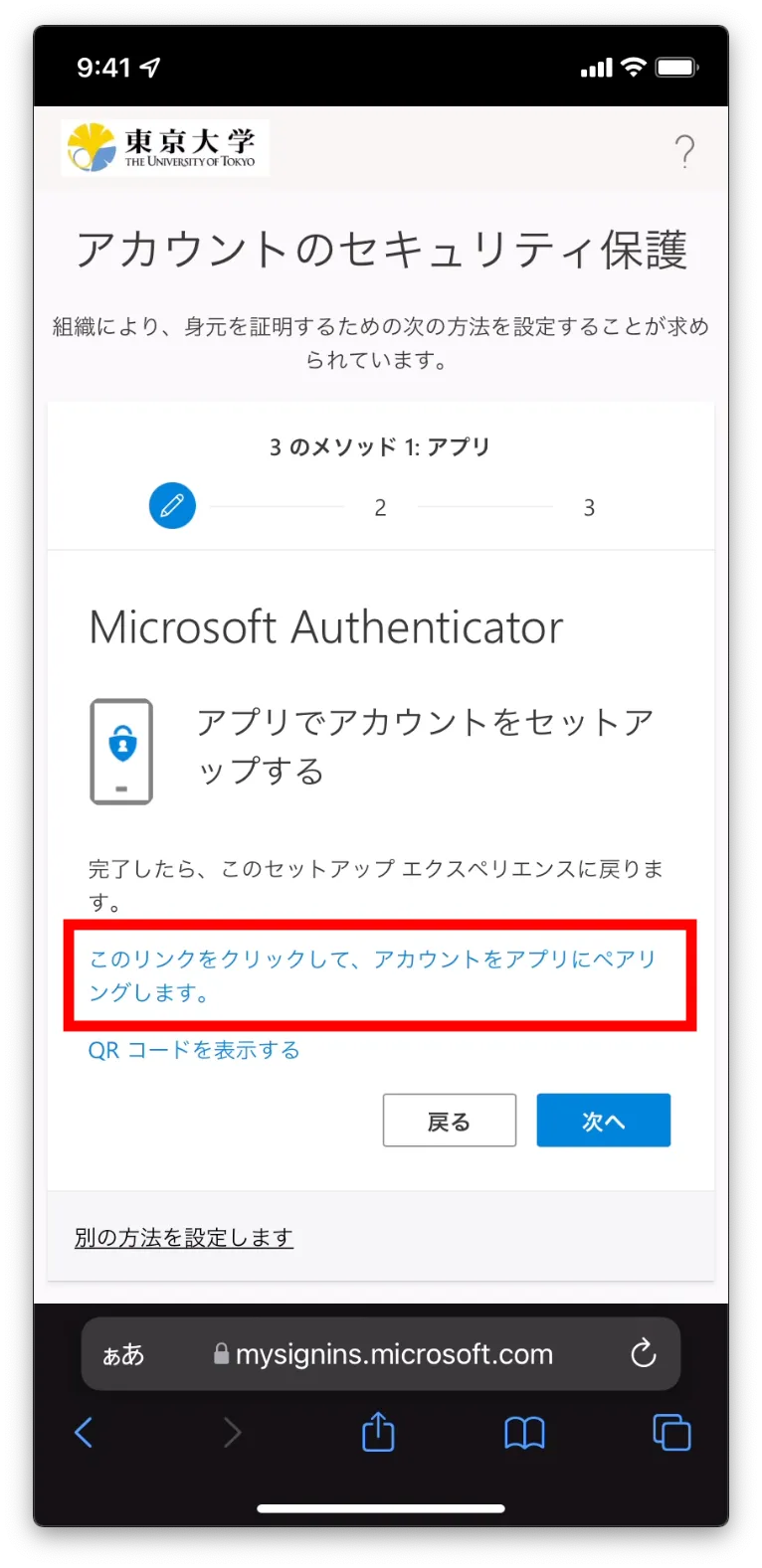 - スマホでこの作業をしている場合:「このリンクをクリックして、アカウントをアプリにペアリングします。」を押してください.Microsoft Authenticatorアプリに移動し,自分のUTokyo Accountが表示されればOKです.元の画面に戻って「次へ」を押してください.