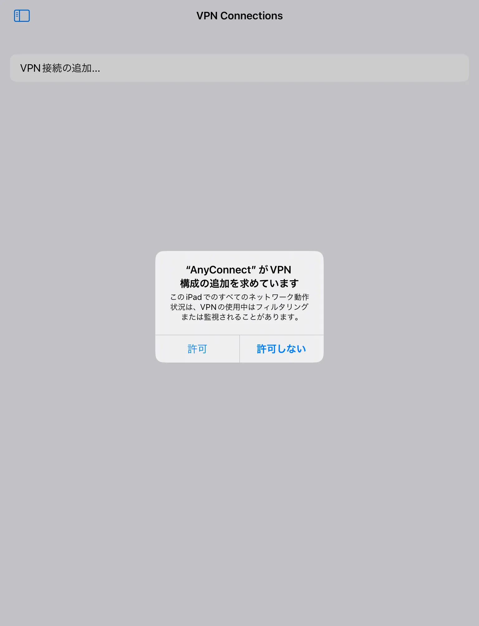 手順E: 「保存」を押すと,以下のようにVPN構成の追加を求められるので,内容の確認の上で「許可」を押します.さらに追加でTouch IDによる認証などを求められることもありますので,その際は認証を行ってください.