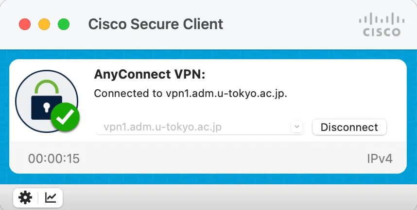 手順I: 再度Cisco Secure Clientをクリックし,現在の状態を確認します.表示された画面で,以下のように「Connected to vpn1.adm.u-tokyo.ac.jp.」と表示されていれば,お使いの機器はUTokyo VPNに接続している状態です.
