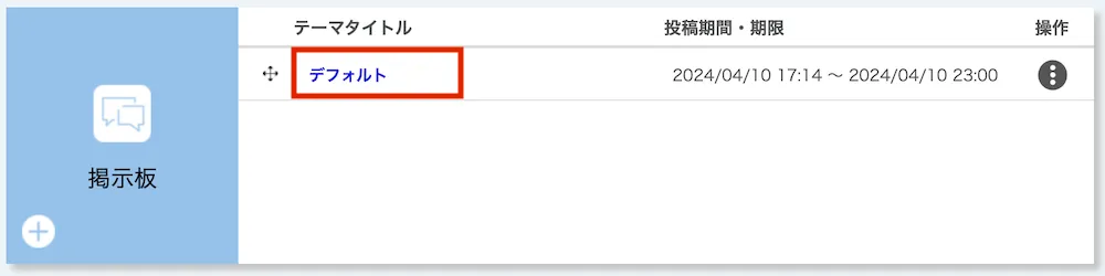 新たにテーマを登録すると,タイトルが「デフォルトのスレッド」であるスレッドが自動的に生成されます.スレッドのタイトルや説明を適切に設定することで,スレッドの目的をわかりやすく示すことが可能になるので,必要に応じてスレッドを編集してください.
