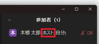 表示された参加者の一覧のうち,ホストになっている参加者には名前の右側に「(ホスト)」の表示があります.