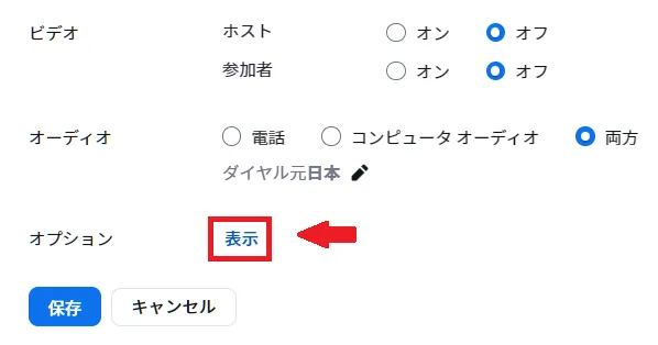 - ミーティングのスケジュール・編集画面で「オプション」の項目の [表示] を選択してください.