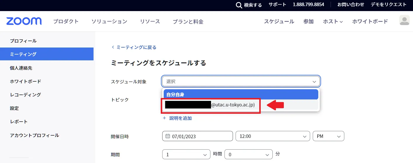 - 「ミーティングをスケジュール」の左側にあるプルダウンメニューから,「すべて」もしくは親ユーザーを選択してください.「すべて」を選択した場合は自分自身のミーティングと親ユーザーのミーティングの一覧が,親ユーザーを選択した場合は親ユーザーのミーティングの一覧が表示されます.