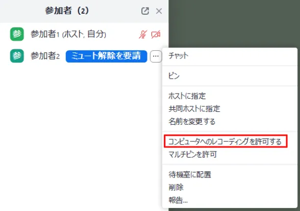 レコーディングの権限を有さない参加者は,ホストや共同ホストにレコーディングをリクエストできます.