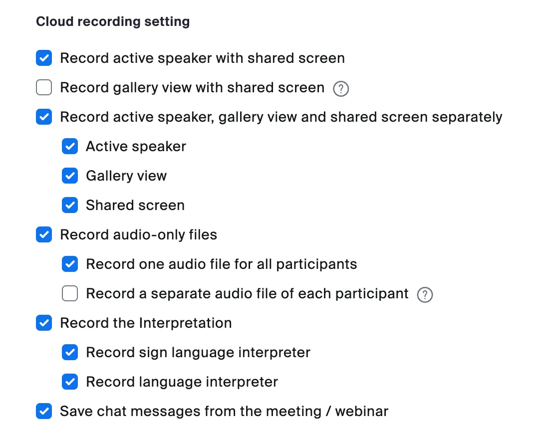 • 共有コンテンツのみをレコーディングする:共有コンテンツのみがレコーディングされ,参加者のビデオはレコーディングされません.